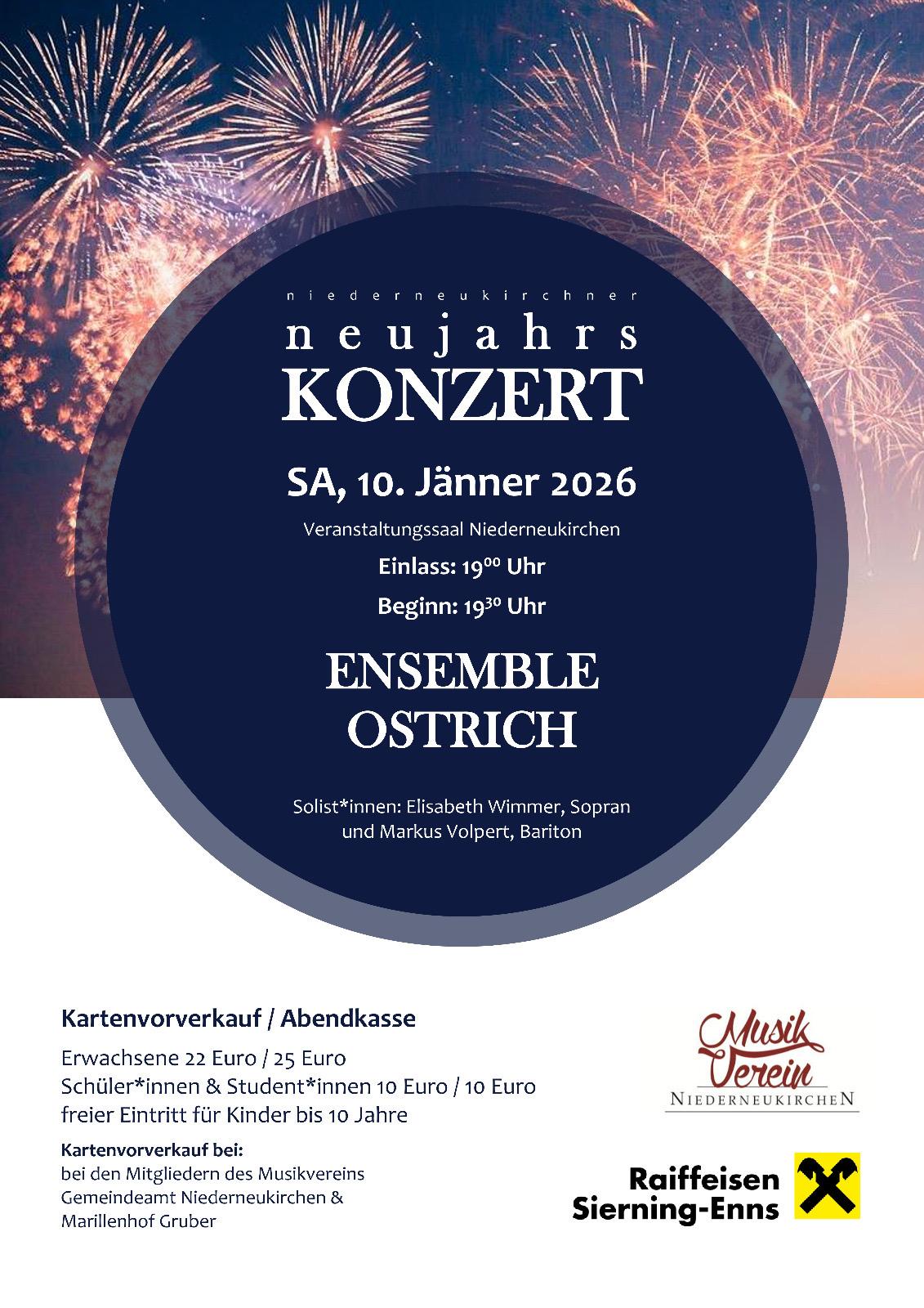 Gleich zu Beginn im neuen Vereinsjahr lädt der neue gewählte Obmann alle Interessierten sehr herzlich zum traditionellen Neujahrskonzert mit dem Ensemble Ostrich. Am Samstag den 10.1.2026 um 19.30 im Veranstaltungssaal Niederneukirchen. Karten gibt es im Vorverkauf (22€, Schüler/Studenten 10€) am Gemeindeamt, beim Marillenhof Gruber und bei den MusikerInnnen des Musikvereines NNK.